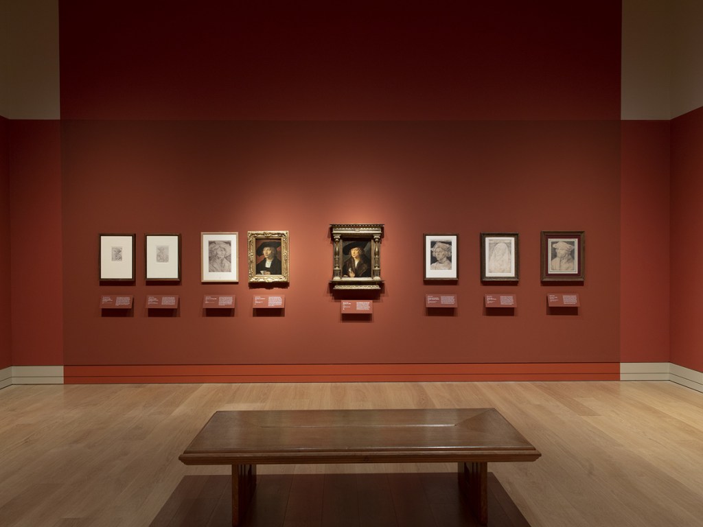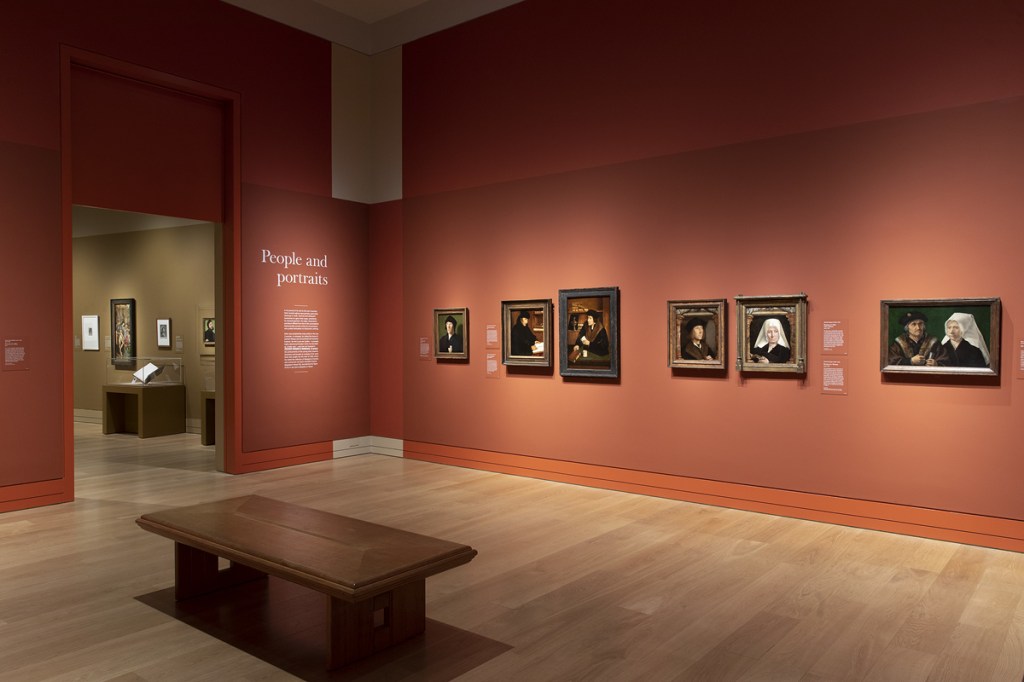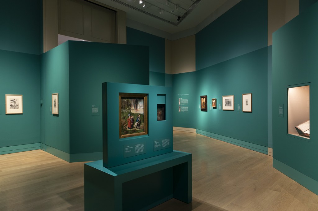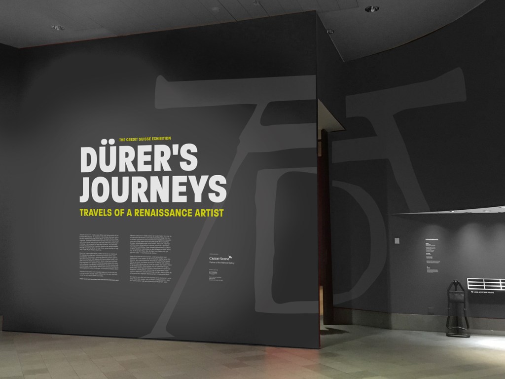 A variety of carefully planned label sizes and styles were required for the large number of works arranged in tight hangs and various showcases. Each room had its unique colourway referencing Dürer’s paintings, and careful consideration was needed for balancing the tonality of the graphics. Dürer signed his works with a monogram, which was recreated in large scale to announce the arrival to the exhibition.